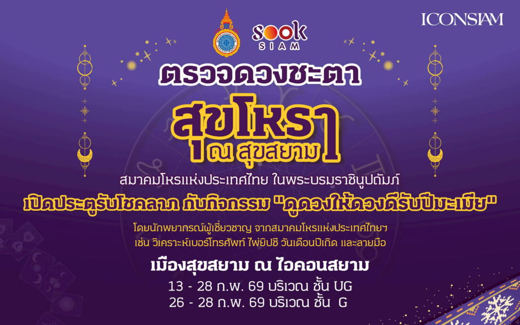 สุขโหรา ณ สุขสยาม เปิดประตูรับโชคลาภ ต้อนรับตรุษจีนปีมะเมีย ชวนคุณมาเสริมดวง เสริมเฮง กับกิจกรรม “ดูดวงให้ดวงดีรับปีมะเมีย” โดยทีมนักพยากรณ์ผู้เชี่ยวชาญจาก สมาคมโหรแห่งประเทศไทย ในพระบรมราชินูปถัมภ์ เจาะลึกทุกเรื่องชีวิต ทั้งโชคลาภ การงาน การเงิน ความรัก สุขภาพ พร้อมเช็กดวงปีชงแบบละเอียด ครบทุกศาสตร์พยากรณ์